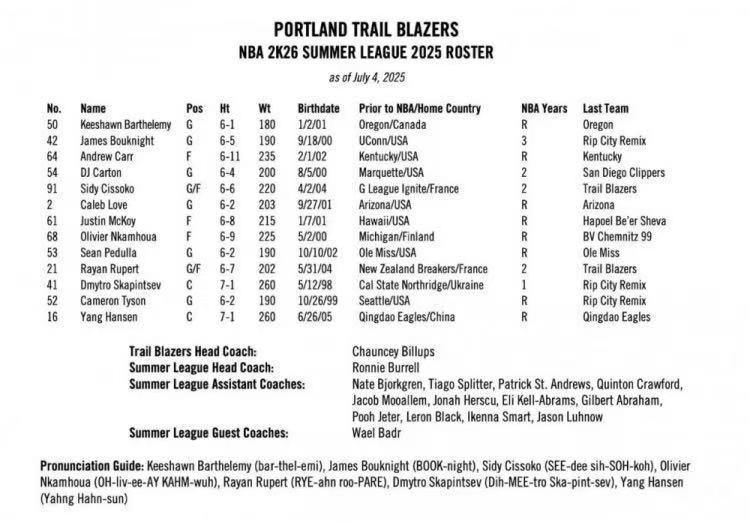 雷速体育7月5日讯 开拓者官方今天公布了夏季联赛大名单,中国球员杨瀚森在列。